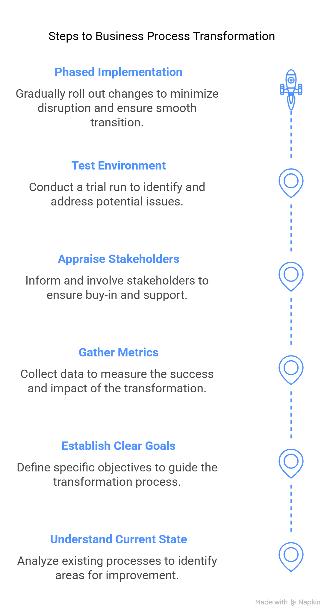 - Clear goals, metrics, and stakeholder engagement are critical for successful business process transformation.