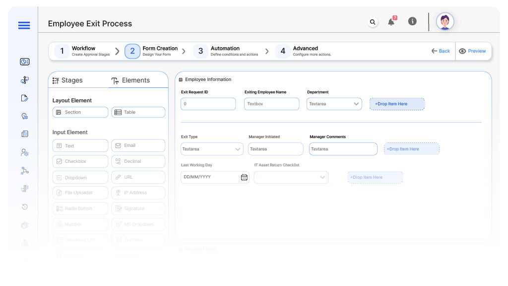Use the Form Builder to add all required fields based on the Field Definitions. Apply conditional logic for fields like Exit Type and Manager Initiated.