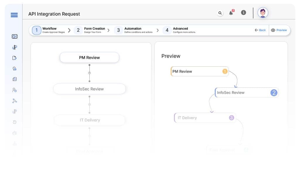 - Multi-Level Approval Routing: Requests first go to the Project Manager or Product Owner, then to InfoSec, and finally to IT Delivery. Cflow enforces dependency-based routing—no task proceeds until prior approvals are completed. This ensures clarity, accountability, and compliance. Teams know exactly where a request stands and what’s pending.
