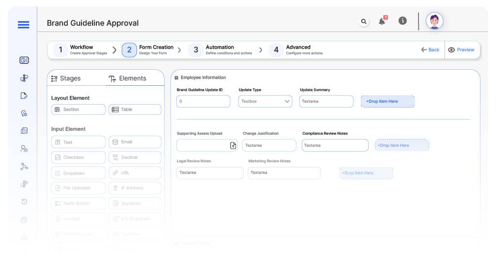 - Centralized Submission Portal: Cflow allows marketing or creative teams to submit updated guidelines, visual assets, messaging changes, and legal references into a controlled approval workflow.