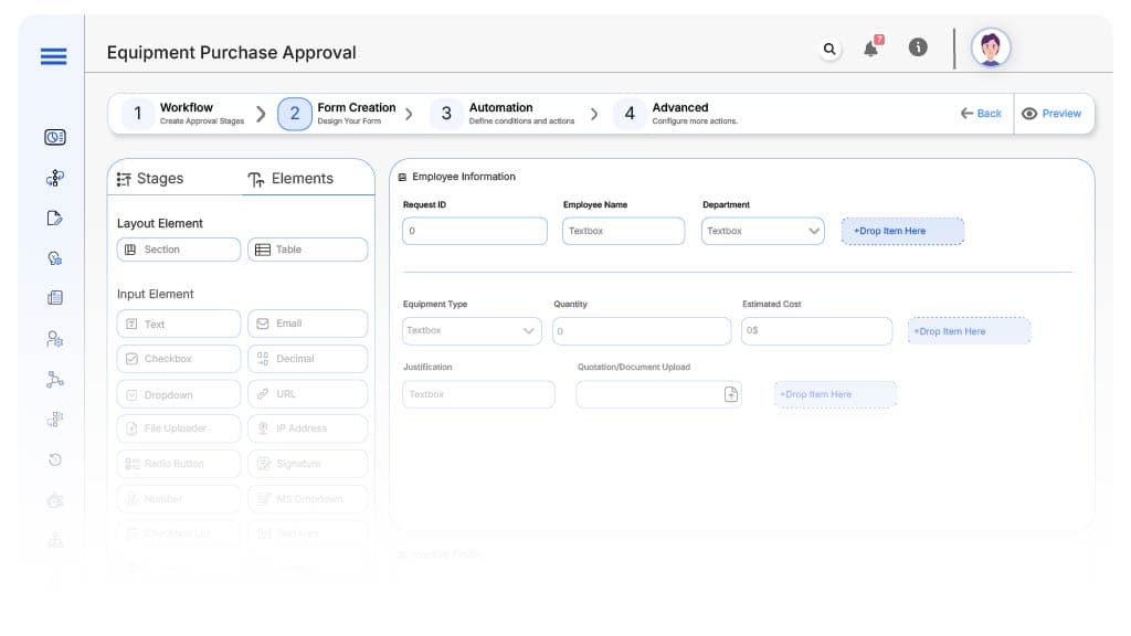 - Role-Based Routing Logic: Requests are routed based on department, cost range, or equipment type. High-cost items are escalated to leadership, while standard purchases follow a fast-track approval path, saving time without sacrificing control. Routing rules can be configured with zero code and updated on demand.